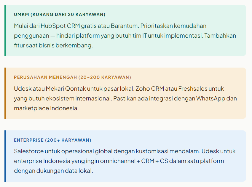 Perlu dicatat: CRM terbaik bukan yang paling banyak fiturnya — melainkan yang paling sesuai dengan skala, proses, dan budget bisnis Anda saat ini.