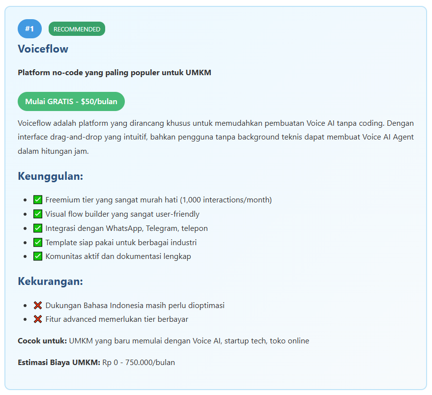 - Untuk yang baru memulai: Voiceflow (freemium)