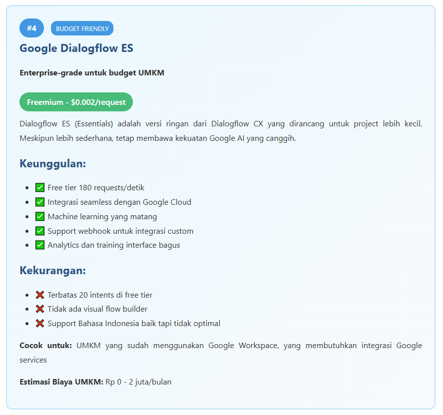 - Untuk integrasi Google: Dialogflow ES