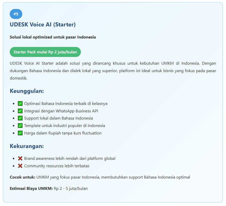 - Untuk pasar Indonesia: UDESK Voice AI