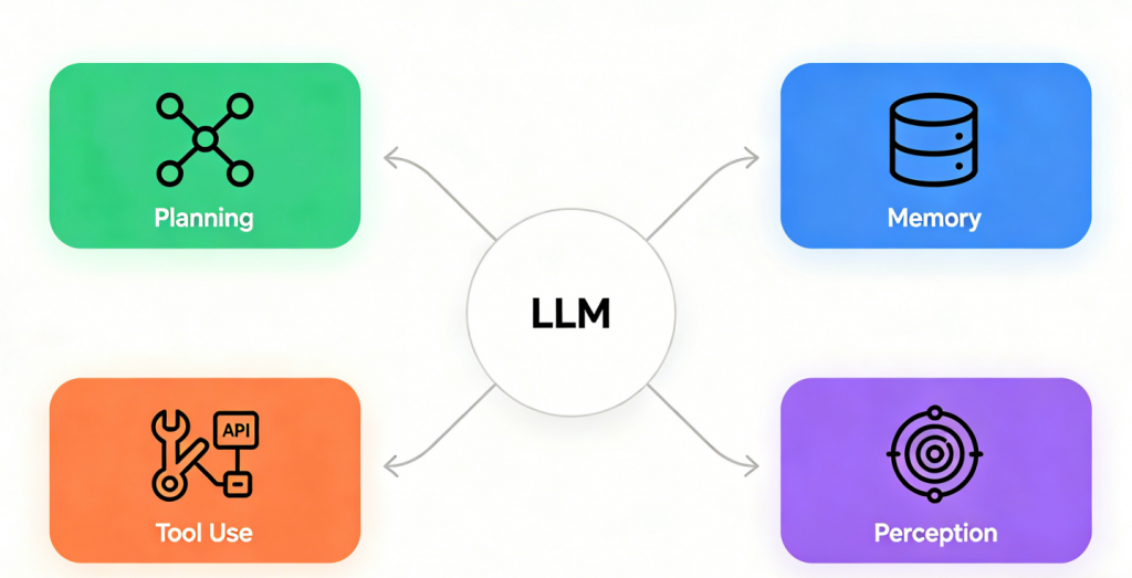 Ilustrasi arsitektur inti AI agent: kolaborasi LLM, planning, memory, dan tool use
