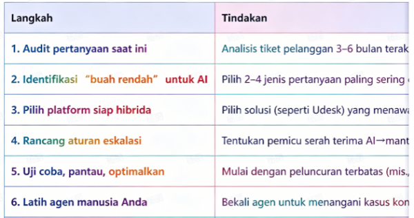 Kesimpulan Utama – Menyeimbangkan Kemampuan: Anggap AI dan agen manusia sebagai rekan tim yang saling melengkapi, bukan pesaing. AI menangani yang dapat diprediksi dan berulang. Manusia menangani yang sensitif dan kompleks. Tim paling cerdas membiarkan masing-masing melakukan yang terbaik dan merancang serah terima yang mulus di antara keduanya.