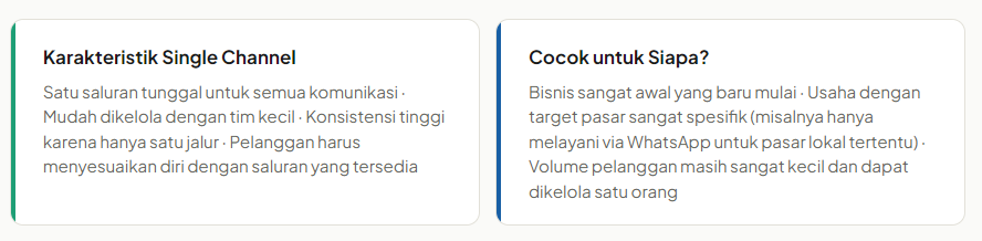 Single channel berarti bisnis hanya berkomunikasi dengan pelanggan melalui satu saluran — misalnya hanya via telepon, atau hanya via email, atau hanya via toko fisik.