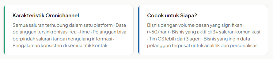 Bisnis sangat kecil (1–2 agen, <30 pesan/hari) bisa mulai dengan 1–2 saluran terpisah (single atau multichannel sederhana). Mulai pertimbangkan omnichannel serius ketika menerima >50 pesan/hari dari 3+ saluran berbeda, atau ketika koordinasi tim CS mulai menjadi hambatan.