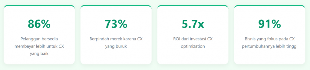 Investasi dalam CX bukan biaya operasional—ini adalah investasi strategis yang menghasilkan pengembalian nyata. Perusahaan yang memprioritaskan CX melaporkan margin keuntungan 60% lebih tinggi dibanding yang tidak, menurut riset Forrester.