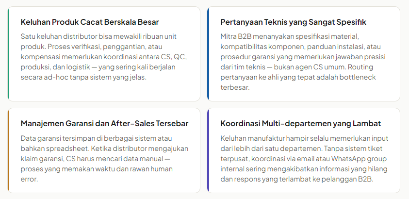 Customer service untuk manufaktur sangat berbeda dari CS konsumer. Pelanggan utamanya adalah distributor, reseller, dan mitra B2B — bukan individu — dengan kebutuhan yang jauh lebih kompleks: