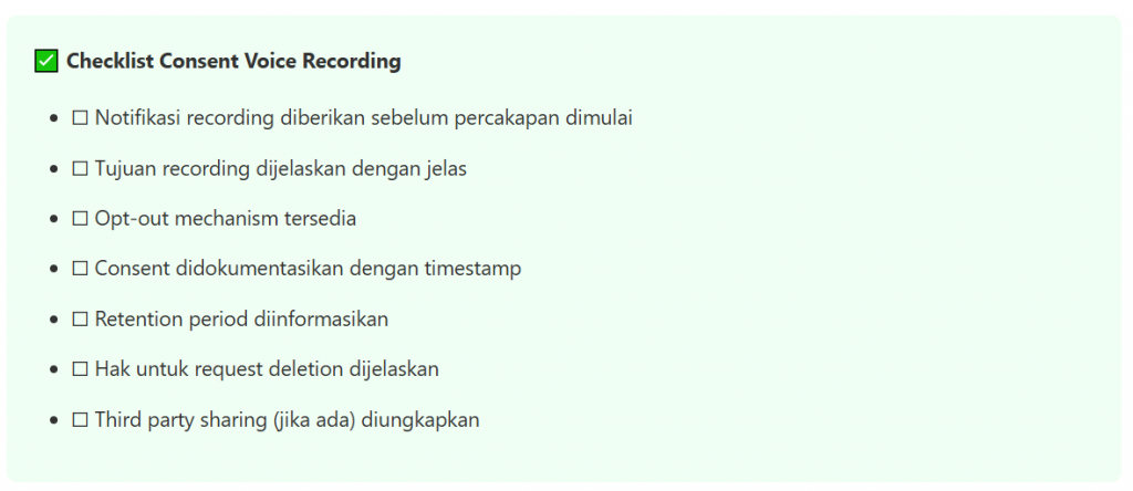 | Consent | Consent harus jelas, nyata, dan didokumentasikan | Recording consent wajib sebelum panggilan |