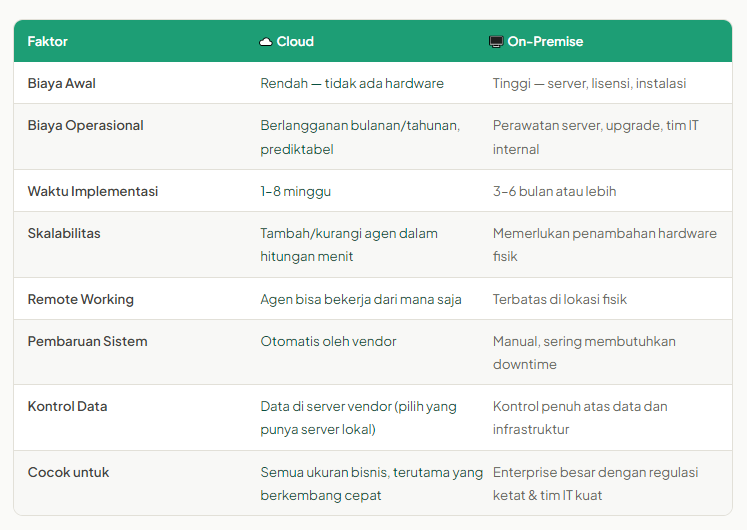 Perbedaan call center cloud vs on-premise · Fitur wajib yang harus dicek sebelum memilih · Checklist evaluasi vendor · Panduan implementasi bertahap · Perbandingan biaya total kepemilikan (TCO)