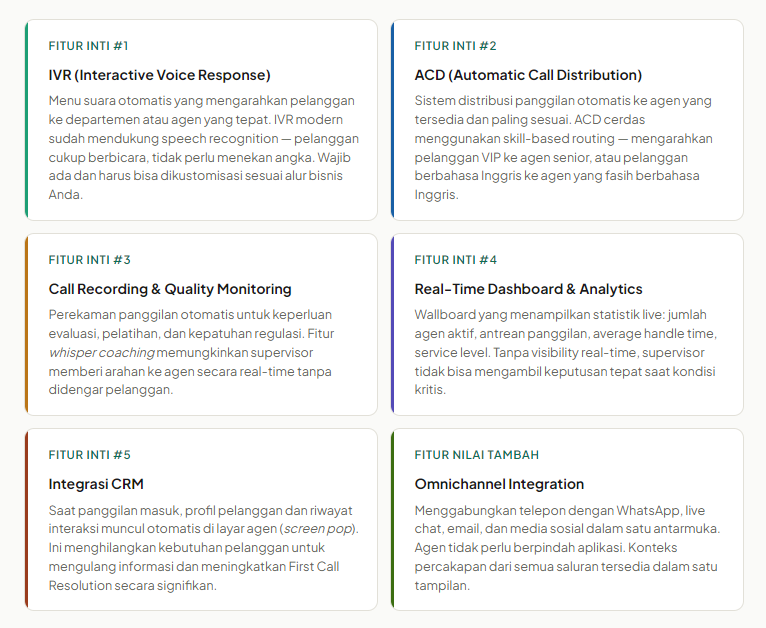 Tidak semua platform call center cloud menawarkan fitur yang sama. Berikut adalah fitur yang wajib ada sebelum Anda memutuskan untuk berlangganan: