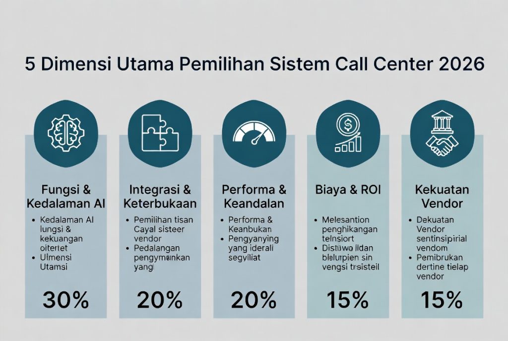 | Fungsi & Kedalaman AI | Routing IVR semantik, alokasi cerdas, outbound (prediktif/progresif/pratinjau), inspeksi kualitas AI, basis pengetahuan, kolaborasi robot | Harus mendukung Agent model besar, tingkat pengambilalihan AI >70% | 30% |