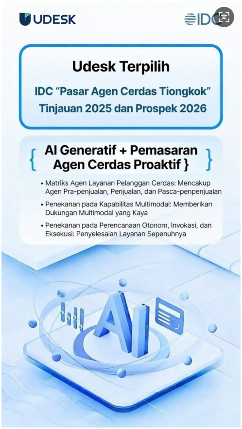 Ringkasan Artikel:Udesk berhasil menjadi satu-satunya perusahaan di industri yang terpilih dalam laporan prestisius IDC “China Intelligent Agent Market 2025 Review and 2026 Outlook” (Maret 2026). Dengan kekuatan platform full-channel, kemampuan AI multimodal, serta implementasi komersial berskala besar di berbagai sektor seperti ritel, manufaktur, dan jasa rumah tangga, Udesk diakui sebagai representasi tipikal perusahaan Tiongkok di bidang Intelligent Customer Service Agent. Laporan ini menandai pergeseran besar AI Agent dari aplikasi tunggal menuju rekonstruksi proses bisnis end-to-end, dan Udesk siap mendukung lebih banyak perusahaan dalam transformasi digital layanan pelanggan menuju era keemasan implementasi AI Agent skala besar.