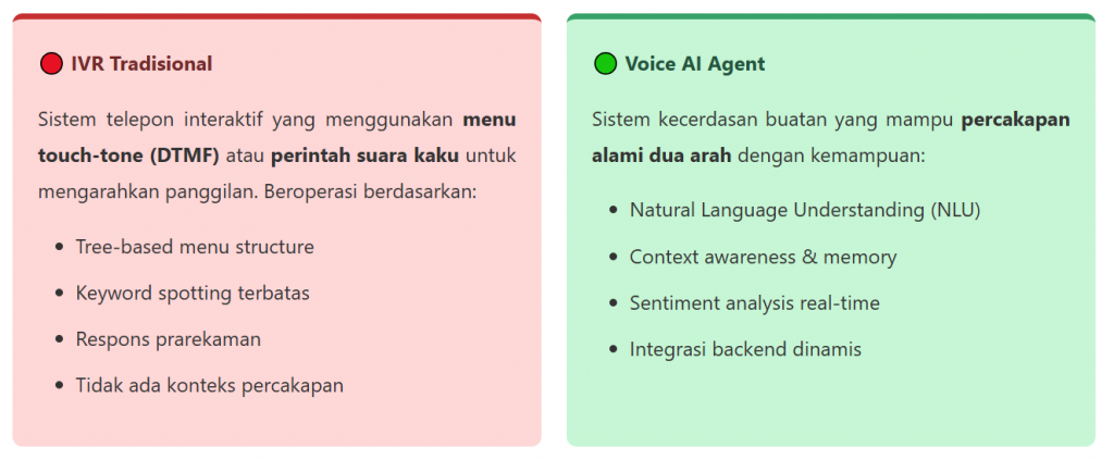 | Personalization | Tidak ada | Berdasarkan histori & profil pelanggan | 🟢 Voice AI |